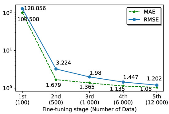 3.2.2. The first stage was fine-tuned with a no-base, manually processed dataset, and the remaining stages were fine-tuned with a preprocessed dataset, which was reworked from the prediction of the previous stage’s fine-tuned model. The first stage achieved 100.508 for the MAE and 128.856 for the RMSE with 100 datasets; therefore, reworking the predictions of the model requires significant manual effort. The second stage, fine-tuned with 500 datasets, was 98.829 and 125.632 lower for the MAE and RMSE than the first stage, respectively. With a considerably low error from the second stage, the reworking dataset requires significantly less manual effort, and repeated fine-tuning from the preprocessed dataset, at the fifth stage yields an MAE of 1.05 and an RMSE of 1.202. Therefore, 500 datasets were considered as the minimum for a task-optimized model. As the number of datasets increases, the range of model improvement decreases, but with our cloud-based deep learning software server and staged fine-tuning, datasets can be easily gathered, and less manual effort is required to process the data.