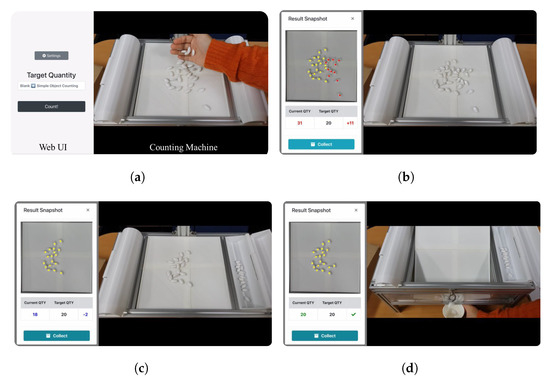 Figure 12 shows snapshots of the scenarios shown in Table 4. To demonstrate the capabilities of the web-based UI and smart counting system, a scenario was carried out assuming that the object was removed excessively. The full video can be viewed through the following link, https://youtu.be/Ox2XAM5OaR0 (accessed on 1 August 2022). The video as well as snapshots showed that the proposed smart system successfully counted the objects not only accurately but also robustly.