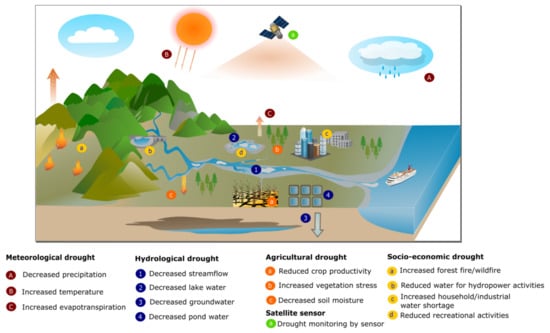 Figure 1. An overview of the drought types and their associated factors and impacts on land features, such as increased crop failure and vegetation stress. This figure is intended to provide a general overview of the main drought types, impacts and responses, as drought conditions may vary from place to place; consequently, their impacts and responses vary. Most of symbols were extracted from the University of Maryland (https://ian.umces.edu/, last accessed on 5 May 2022).