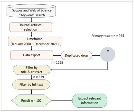 Here, TS means “topic”, such that keywords appear in the titles, abstracts and/or keywords of a given paper. The “*” means the inclusion of everything after, such as Vietnam or Vietnamese, whereas OR and AND are Boolean conditions to navigate the search. We used the same keyword search expression in both Scopus and Web of Science, with a two-step process. Firstly, we searched for all of the articles that matched our keywords, and this search query returned a large number of research articles associated with the topic from the two databases, for a total of 1295 articles. It is observed that many of the papers appeared in both databases; as such, we removed all duplicated articles, and this resulted in a total of 954 remaining papers. Finally, we manually filtered each article and selected papers that focused on remote sensing-based drought monitoring.
