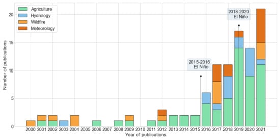Before the El Niño 2015–2016 event, there was a small number of drought articles reported, less than five articles per year, and some years were even observed with an absence of drought publications (e.g., 2005, 2007, 2010). However, drought studies has witnessed a substantial growth since 2016; the largest number of drought articles was reported in 2021, with 21 articles. It was observed that the El Niño 2018–2020 event caused the worst drought in the past two decades [44]. Most of the examined studies focused on agricultural droughts, followed by meteorological droughts. The year 2019 had the largest number of agricultural drought publications (14 articles), while meteorological droughts were the most reported in 2021 (Figure 3). Hydrological drought and forest-related fire drought received less attention, especially in the first 15 years of the 21st century.