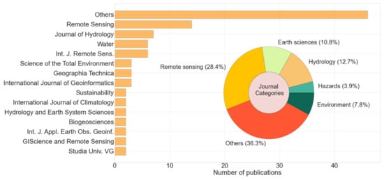 Figure 4. The number of journals and categories that reported drought publications in Southeast Asia between 2000 and 2021. The “others” in the horizontal bar plot represents journals with only one article, whereas the category “others” in the pie chart contains journals with broad topics that fall outside of the pre-defined categories (e.g., agriculture and forestry). Some of the journal abbreviations used in this figure follow the list compiled by the Swiss Federal Institute for Forest, Snow and Landscape Research (https://www.wsl.ch/, accessed on 25 March 2022).
