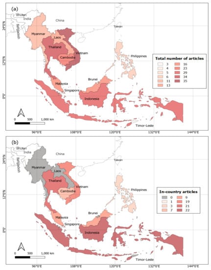 Figure 5. The map shows the spatial distribution of drought publications in Southeast Asian countries. The color codes indicate the total number of reported drought articles, including local and transboundary studies (a) and the number of reported local and national drought publications (b). The maps used in this figure were obtained from GADM (https://gadm.ogr, last accessed on 25 February 2022).