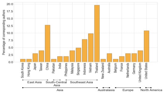 Figure 6. The contribution of corresponding authors to drought publications over the past two decades. Among the Southeast Asian countries, Thailand and Vietnam had the highest percentage of corresponding authors, whereas China and the United States of America contributed significantly to the remote sensing-based drought studies of Southeast Asia.