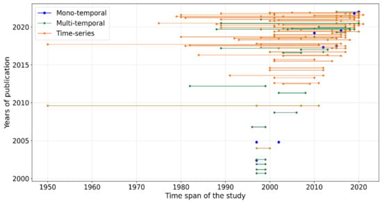 Figure 7. The articles in drought remote sensing, along with the reported investigated timeframe. The various colors represent mono-temporal (blue), multi-temporal (green), and time-series (dark yellow) studies, respectively.