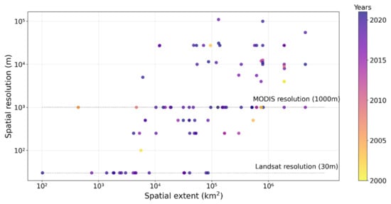 Figure 8. The relationship between the spatial extent and mapping resolution among all of the drought remote sensing articles in Southeast Asia from 2000 to 2021. The color bar represents the years of publications.