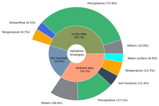 Figure 9. The validation strategies and data used in the corresponding strategies. The inner chart presents validation strategies, whereas the outer chart depicts the specific data used to validate the produced drought products. This review considered the major validated data, but it is admitted that few studies are reported to use more than one data type for validation.