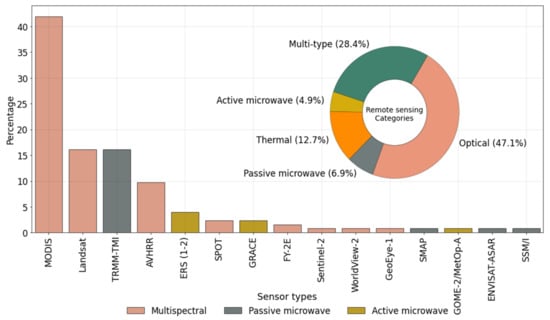 Figure 10. Various sensors used for drought monitoring and assessment. The color codes represent the types of sensors in the bar plots, while the pie chart indicates the percentage of articles associated with each remote sensing category.