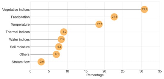 Given the diversity of remote sensing sensors and categories, drought information can be derived from a wide array of input variables. In this review, various remote sensing inputs and indices were taken into consideration. We categorized all of the derived remote sensing-based input variables into one of eight pre-defined groups, such as vegetative indices, precipitation, temperature, water indices, and thermal indices. Figure 11 presents the different input variables extracted from remote sensing measurements for drought monitoring and assessment in Southeast Asia over the past 21 years. Together, vegetation, temperature and precipitation accounted for nearly 70% of the input extracted variables for drought characterization and assessment.