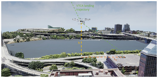 When this latter requirement cannot be met, as in complex urban areas, the approach and landing path should be selected, searching for a compromise between the constraints linked to aerodynamic and obstacle avoidance. In this respect, some approach solutions have been proposed, foreseeing a final vertical phase (according to the VL paradigm) in which the VTOL aircraft descends at a limited sink rate. For instance, the 3-stepped approach trajectory involves a descent with a fixed approach path until 200 m height above the vertiport, a horizontal forward flight to the point right above the landing pad, and a final vertical descent [8,9]. Such a vertical descent is also proposed in the Terminal Area of Multi-vertiport system Concepts of Operations [10]. An alternative trajectory is defined by Song et al. [11,12], who propose a vertiport airspace model, namely the Vertiport Terminal Control Area (VTCA), optimized to control the approach of the arriving aircraft through holding circles where the vehicles hover while waiting for the authorization to complete the landing procedure.