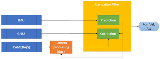 - The implementation of a vision-aided, multi-sensor-based navigation architecture which integrates the measurements of an IMU, a standalone GNSS receiver, and a monocular camera. A multi-mode data fusion pipeline based on an EKF is designed, which takes the distance from the landing area into account and adopts ad hoc strategies to self-estimate navigation performance degradation and improve integrity, protecting the navigation solution and consequently the overall landing procedure from visual sensing anomalies.