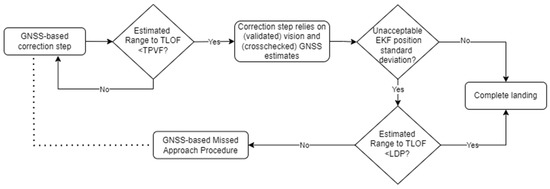 Links to YouTube videos of the simulated trajectories: Daylight VTCA: https://youtu.be/a6sy25SQ7Ek (access on 6 May 2022). Daylight 3-stepped: https://youtu.be/cX2LAlXhfqM (access on 6 May 2022). Perturbed VTCA: https://youtu.be/UTNScoKGh1w (access on 6 May 2022). Perturbed 3-stepped: https://youtu.be/0FEk8U1IKGc (access on 6 May 2022). Night VTCA: https://youtu.be/9VPTHRFDVgA (access on 6 May 2022). Night 3-stepped: https://youtu.be/5ByamKI0NXI (access on 6 May 2022). Low visibility VTCA: https://youtu.be/yEQv_v3f8v0 (access on 6 May 2022). MAP initialization VTCA: https://youtu.be/WRu7z9vspwA (access on 6 May 2022).