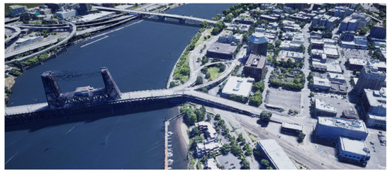 This Section introduces the simulation environment which has been developed to test the performance of the proposed navigation filter. The Portland heliport and its surroundings have been recreated in the gaming simulation environment Unreal Engine (UE) 4 to reproduce a potential scenario that might be selected for future flight test activities (Figure 7). The area covered by the reproduced scenario is 2 km × 2 km, which is considered adequate to analyse each phase of the simulated landing trajectories (Figure 1). The height above the terrain of the heliport selected for the landings is 24 m.