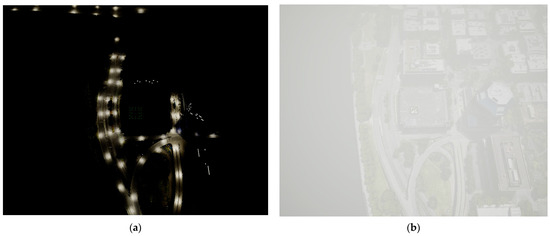 (a) UE4 reproduction of Portland heliport and its surroundings at night; (b) UE4 reproduction of Portland heliport and its surroundings with fog.