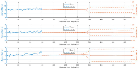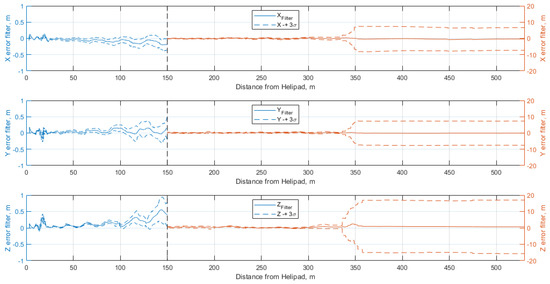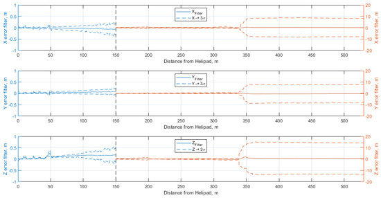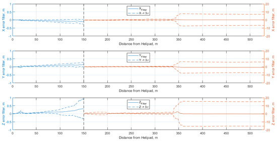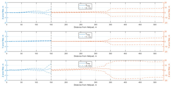 Figure 11 and Figure 12 show the EKF positioning error for the VTCA and the 3-stepped landing trajectories, while the positioning error statistics evaluated in different segments of the paths are reported in Table 3 as a function of the reducing distance from the landing pad.