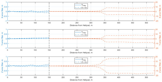 LM position estimates errors average over 50 simulations and 3−sigma bounds. VTCA landing trajectory in nominal visibility conditions. The plot scale is increased in the last 150 m to better show the errors in the final phase of the approach. The 350 m distance (black vertical line) from the landing pad is the selected threshold for TPVF.