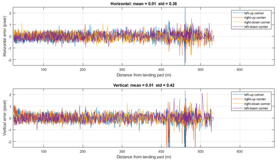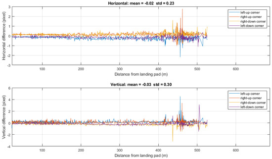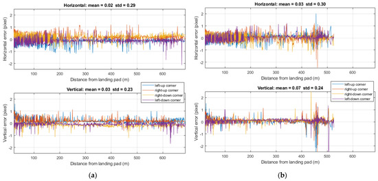 In this case, the vision algorithm does not detect the AT marker placed on the landing pad at the initialization of the approach procedure. However, in this case, the postponed marker recognition does not affect the accuracy of the filter position estimates at the transition to the visual flight phase and later in the approach, since the visual algorithm needs few image frames to be correctly initialized and the implemented EKF correction step relies only on GNSS estimates until the selected distance of 350 m. In case of worse meteorological visibility conditions not allowing the markers to be recognized at 350 m distance, the implemented EKF would autonomously impose a MAP when the estimated covariance of the EKF reaches the imposed threshold. The positioning errors in meters are almost identical to the previous cases and are thus not reported. Indeed, it is interesting to analyze the image processing error, i.e., the error in extracting the corners from the images, to verify if and how it is affected by the degraded visibility conditions. This is done in Figure 18, which reports the difference between the positions of the corners recognized by the image processing algorithm and their reprojections estimated through the true markers’ pose in both the daylight (a) and the low-visibility test case (b). The fact that the detection error (i.e., image processing error) has the same order of magnitude in both the cases explains why the resulting positioning errors are similar. Figure 19 reports the difference in the four detected AT corners’ coordinates in the image frames between the nominal visibility case and the introduced low-visibility case.