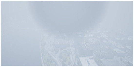 As anticipated before, the EKF architecture has also been tested for low visibility scenarios with the aim to check the robustness of the navigation architecture in challenging visual conditions and prove the autonomous initialization of balked landing procedures in case of failures and anomalies in the landing pad visual tracking algorithm. The first test case introduces a uniform fog in the daylight scenario, reproducing maximum meteorological visibility of 500 m (Figure 17). This parameter represents the distance at which the landing pad is clearly detected by the image processing algorithm (similarly to the Runway Visual Range adopted for the approval of the aircraft’s final approach phase). Consequently, it is not a setting parameter characterizing the creation of the simulation scenario within Unreal Engine, but rather it has been a-posteriori evaluated. Clearly, by modifying the fog parameters (such as density and speed), the maximum meteorological visibility can be indirectly changed.
