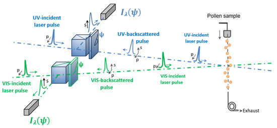 Following Equation (2), accurate values of the lidar can be retrieved from accurate evaluations of . To evaluate the ratio of pure pollen, the laboratory π-polarimeter scheme in Figure 2 is operated. This laboratory π-polarimeter is unique as it accurately measures the light intensity backscattered by pollen particles in laboratory ambient air at the specific lidar backscattering angle of 180.0°. The backward scattering direction is indeed covered by accuracy, at 180.0 ± 0.2° scattering angle, after precise alignment of a well-specified polarizing beam-splitter cube (PBC), with a precision of 1 mm per 10 m. As in dual-wavelength lidar applications, the π-polarimeter relies on a ns-pulsed laser source (not represented in Figure 1) and is actually composed of two π-polarimeters, one per wavelength, to evaluate the (355, 532) nm wavelength dependence of the lidar PDR of pure pollen. Special care has been taken to ensure that polarization and wavelength cross-talks are negligible in the π-polarimeter. Furthermore, to gain accuracy in the lidar -retrievals, a quarter-wave plate (QWP) was added to each π-polarimeter, to analyze the polarization state of the backscattered radiation for a set of incident polarization states, as explained below.