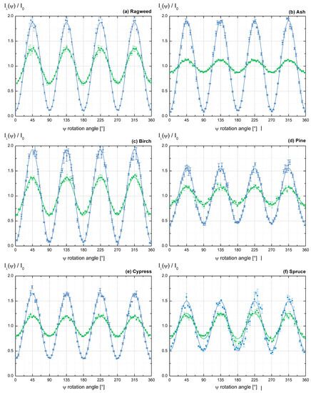 Recorded variations of the backscattered light intensity with the -rotation angle at 355 (in blue) and 532 nm (in green) wavelengths for the following pollen taxa: (a) ragweed, (b) ash, (c) birch, (d) pine, (e) cypress and (f) spruce. The experimental data points are adjusted with Equation (4) to evaluate , then to obtain the lidar PDR from Equation (5).