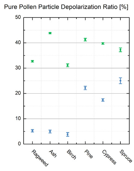 - Shang, X.; Giannakaki, E.; Bohlmann, S.; Filioglou, M.; Saarto, A.; Ruuskanen, A.; Leskinen, A.; Romakkaniemi, S.; Komppula, M. Optical characterization of pure pollen types using a multi-wavelength Raman polarization lidar. Atmos. Chem. Phys. 2020, 20, 15323–15339. [Google Scholar] [CrossRef]