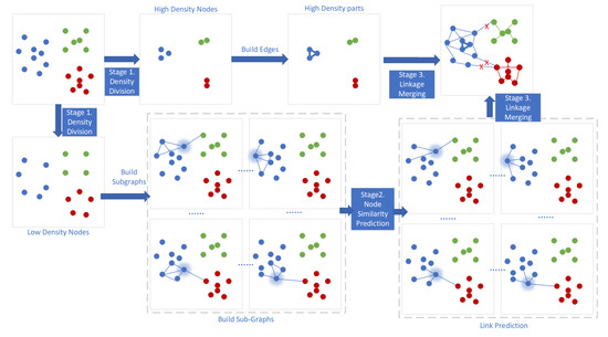 The third stage of the framework is linkage merging to form the clusters. A pseudo label propagation approach organizes the nodes from high-density and low-density parts into clusters.