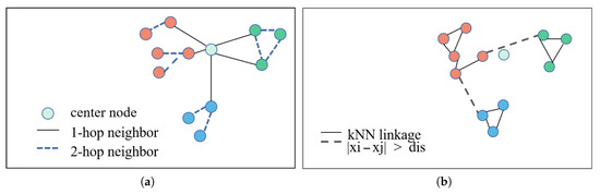 The second phase is building edges for all nodes in a certain ASG. We calculate an adaptive average distance , iteratively obtain the maximum Euclidean distance between each direct neighbor (one-hop) and its indirect neighbors (two-hop), and then calculate the average of these maximum values to obtain the final adaptive distance. For a node , we look for potential edges in the k nearest neighbors of q. If a node r appears in and the distance between q and r is less than , the edge (q, r) is added to the set . This process can ensure that sufficient structure of the subgraph. Then we get the subgraphs with central node p, the node-set , and the feature set .