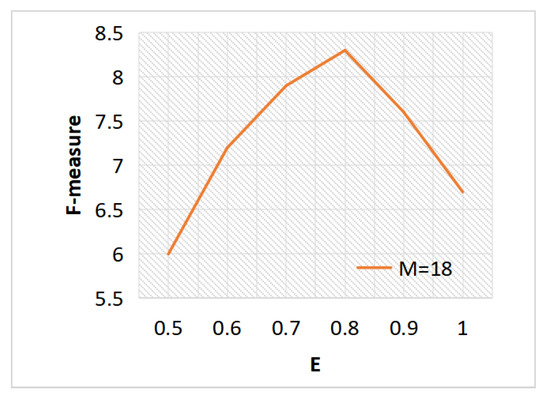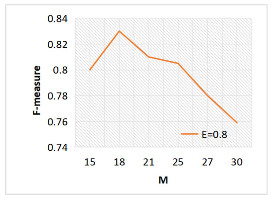 Because a bigger E makes the estimated density of nodes more discriminative, Figure 5 illustrates that F- increases as E grows from 0.5 to 0.8, while F- begins to decrease after 0.8. When E is small, that means nodes might have few nodes around them and they are discriminative to each other. When E is big, that means nodes might include many nodes from different clusters and this will affect the performance. Figure 6 illustrates that a greater M also results in a higher F- from 15 to 18. The F- states to decrease after 18. This is because a too big M value makes DDC-GNN create big strong connected components in the high-density parts, which may result in wrong clusters. When M decreases, DDC-GNN generates small strong connected components, which rely on the last clustering step to link them back.
