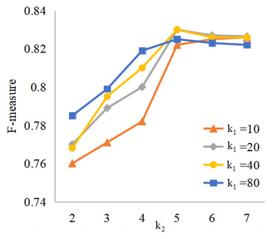 It is obvious that the performance improves greatly with a bigger value of in the early stages. More additional neighbor nodes may be introduced by a bigger , which will also increase the number of candidate node pairs (center node and its neighbors). As the value of increases, the overall performance shows an upward trend. The contextual information collected by the subgraph becomes increasingly adequate as increases in value. The performance achieves saturation at a specific level of and . When and are in a specific range, it may be concluded that it can forecast the connectivity accurately.