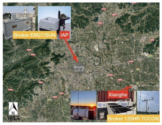 The location of the Bruker EM27/SUN measurements in Beijing (urban) and the Bruker IFS 125HR measurements in Xianghe (suburb). The background map is from Google Maps with the name (English and Chinese) of Beijing remarked (https://www.google.com/maps, accessed on 30 June 2022).
