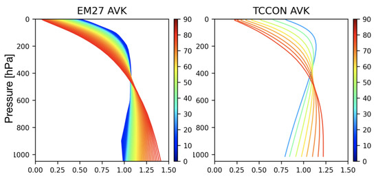 The column averaging kernels of Bruker EM27/SUN (left) and Bruker IFS 125HR (right) CO retrievals varying with the solar zenith angle, which are both analysed by the GGG2020 code.