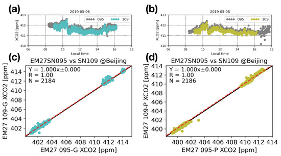 The EM27/SUN SN095 and SN109 XCO measurements retrieved by GGG2020 (a) and PRFFAST v1.0 (b) on 6 May 2019, together with their correlation plots on all 10 measurement days using GGG2020 (c) and PRFFAST v1.0 (d). The red dashed line is the linear fitting (). R is the Pearson correlation coefficient. N is the number of co-located data.