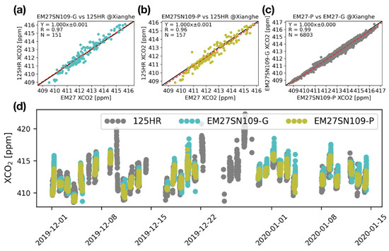 The scatter plots between the Bruker 125HR (TCCON) and the Bruker EM27/SUN SN109 co-located XCO hourly means retrieved by the GGG2020 code (a) and by the PROFFAST code (b) in Xianghe. The scatter plots between the Bruker EM27/SUN SN109 individual XCO retrieved by the GGG2020 code and by the PROFFAST code (c). The red dashed line is the linear fitting (). R is the Pearson correlation coefficient. N is the number of co-located data. The time series of the Bruker 125HR (TCCON) XCO measurements and the Bruker EM27/SUN SN109 measurements retrieved by the GGG2020 and PROFFAST v1.0 codes between December 2019 and January 2020 (d).