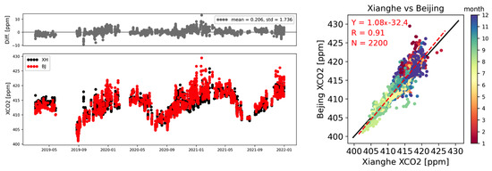 Currently, there are two international networks of FTIR XCO measurements, namely the Total Carbon Column Observing Network (TCCON) [19] and the Collaborative Carbon Column Observing Network (COCCON) [20]. TCCON uses a very stable instrument (Bruker IFS 125HR) and records solar near-infrared (NIR) absorption spectra from 4000 to 11,000 cm with a spectral resolution of 0.02 cm. The systematic uncertainty of TCCON XCO has been corrected by comparison with in situ (aircraft and AirCore) vertical profiles using a WMO standard, and the remaining systematic uncertainty of TCCON XCO measurements is limited (within 0.05%) [19,21]. COCCON uses a portable FTIR (Bruker EM27/SUN) and records NIR spectra with a spectral resolution of 0.5 cm. Previous studies have demonstrated that the TCCON and COCCON XCO measurements show good agreement, with similar precision [22,23]. The Bruker IFS 125HR FTIR measurements have been carried out in Xianghe since June 2018 (about 50 km southeast of Beijing), affiliated to the TCCON. The FTIR measurements between June 2018 and July 2019 in Xianghe have been used to validate the OCO-2 v9 satellite retrievals [24], and they found that the mean and std of the differences between OCO-2 and TCCON (GGG2014) measurements between June 2018 and May 2019 are 0.62 ± 1.20 ppm. Both TCCON and OCO-2 XCO retrieval algorithms have been updated since then. Since the time coverage is relatively short (about one year), a loose co-location threshold (5latitude × 10longitude around Xianghe) was adopted [24].