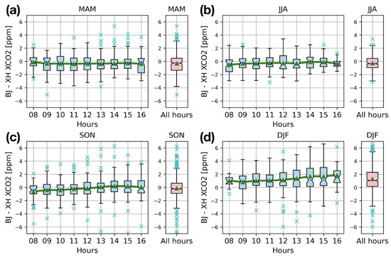 Box plots of the XCO (BJ-XH) observed by two FTIR measurements in each hour and in four seasons ((a) MAM: spring; (b) JJA: summer; (c) SON: autumn; (d) DJF: winter). Each box plot shows the values of relative difference for the maximum (upper solid line), 75th percentile (top of box), median (line through middle of box), mean (green triangle), 25th percentile (bottom of box), and minimum (bottom of solid line) of the distribution. The blue crosses are the outliers.