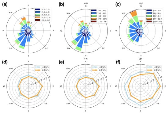The wind rose plot of the regional mean wind speed and wind direction within 39.5–40.0 (latitude) and 116.0–117.0 (longitude) at 950 hPa derived from the ERA5 reanalysis data on all the FTIR measurement hours (a); in spring, summer, and autumn (March–November (b)); and in winter (DJF (c)). The medians of the XCO at eight wind directions in all seasons (d); in spring, summer, and autumn (March–November (e)); and in winter (DJF; (f)). Here, we define weak wind and strong wind with a wind speed of <3 m/s and >3 m/s, respectively.