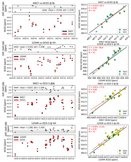 The time series and correlation plots of the co-located FTIR and OCO-2/3 satellite measurements. From top to bottom: EM27/SUN against OCO-2 in Beijing; 125HR against OCO-2 in Xianghe, EM27/SUN against OCO-3 in Beijing; and 125HR against OCO-3 in Xianghe. OCO-2 provides nadir and glint measurements, and OCO-3 provides nadir and snapshot area mode (SAM) measurements over Beijing and Xianghe.