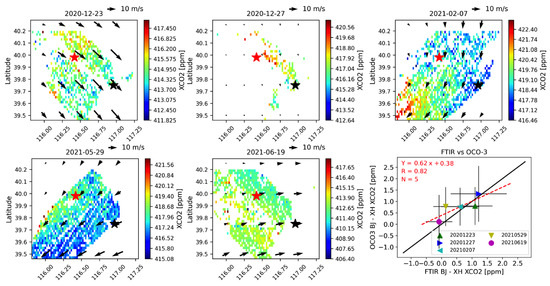 The spatial distribution of XCO observed by the OCO-3 SAM measurements, together with the wind at 950 hPa, on 23 December 2020, 27 December 2020, 7 February 2021, 29 May 2021, and 19 June 2021 over Beijing and Xianghe FTIR sites, remarked as the red and black stars, respectively. The right bottom panel is the scatter plot between the XCO (BJ-XH) observed by FTIR measurements and XCO observed by the OCO-3 SAM measurements. The error bar is the uncertainty of the FTIR and OCO-3 measurements.
