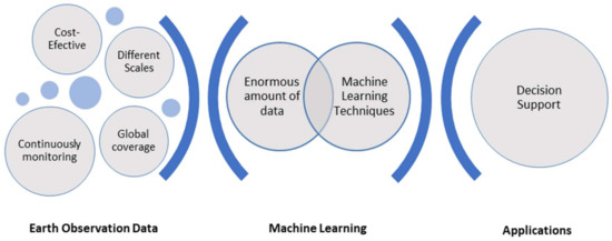Despite the disadvantages above, EO has been widely used in several fields, mainly due to its cost-effective contributions and continuous data acquisition over large areas and periods of time. According to COPERNICUS [41], areas such as: agriculture [35], which plays a crucial role in our society [42]; climate [43], where the effects of its changes (i.e., storms, droughts, fires and flooding) are becoming more recurrent and stronger, having a huge impact in essential global ecosystems such as agriculture and natural resources [44]; forests [36], in which resources are continuously depleting [45]; marine habitats [46], which represent more than 70% of Earth’s surface and generate 50% of the oxygen, 97% of the water and 1/6 of the animal protein that our society needs [47]; mining [48], where metals and minerals that are essential for modern applications (e.g., high-tech products, renewable energy, buildings) are obtained [49]; and renewable energy [50], where there is a global agreement to increase the use and support of renewable sources (e.g., solar energy, wind power, hydropower, biomass energy, waves, tides, and geothermal energy) [51] are among those with higher relevance. Moreover, EO can also be used to exploit new opportunities (i.e., management of natural resources) [19], as well as to produce relevant statistics and indicators to analyze and quantify the SD [9,26,52]. However, given the amount of data generated through EO sources, it is essential to employ methodologies focused on intelligent techniques (e.g., machine learning) to preprocess the data, extract hidden insights and predict or classify future events or samples.
