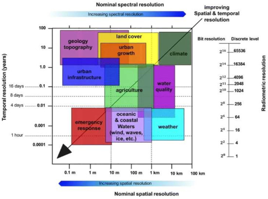 Figure 2 presents the resolution requirements (i.e., spatial, spectral, radiometric and temporal) for several fields such as agriculture, land cover and water quality. The climate field is the least demanding regarding spatial and temporal resolutions, yet it has a higher demand for spectral resolution. On the opposite side is the emergency response field, which requires the finest spatial resolution possible and a higher revisit time; however, it has the lowest spectral resolution requirement.