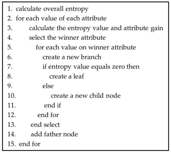 Machine learning algorithms (MLAs), as mentioned, play a major role in the ML workflow. According to Gurevich [75], Dourish [76] and Yanofsky [77], there is some debate about the definition of an algorithm and even if it can be defined. Despite that, several entities and researchers have their definitions; for example, Merriam-Webster [78] defined an algorithm as “a step-by-step procedure for solving a problem or accomplishing some end”, while Hill [79] defined it as “a finite, abstract, effective, compound control structure, imperatively given, accomplishing a given purpose under given provisions” and Kaartinen [80] proposed an informal definition reading “any well-defined computational procedure that takes some value, or set of values, as input and produces some value, or set of values, as output”. Therefore, an MLA should be represented by a pseudo-code in which each step of the MLA implementation is well defined. As an example, Figure 4 presents the pseudo-code of a Decision Tree (i.e., ID3).