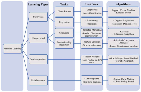 There are different types of MLAs, categorized according to their learning strategy and capable of performing different tasks. Figure 5 presents the types of ML, following studies presented by Dey [53], Dutta et al. [81] and Moubayed et al. [82]. These are: supervised, unsupervised, semi-supervised and reinforcement, followed by the tasks of each ML type (i.e., classification, regression, clustering and dimensionality reduction), as well as examples of use cases and ML algorithms for each task.