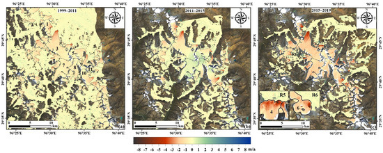 Figure 3 shows the derived glacier surface elevation change rates. During the three consecutive observation periods (1999–2011, 2011–2015, and 2015–2019), the average glacier surface elevation change rates were −0.83 ± 0.02 m/a, −0.33 ± 0.02 m/a, and −1.58 ± 0.02 m/a, respectively, and the glacier area covered by effective elevation change measurements accounted for 59.3%, 57.7%, and 56.0% of the total glacier area, respectively. The first and second highest thinning rates (−8.80 m/a and −8.24 m/a, during period 2015–2019) were found in the glacier areas marked by rectangles R5 and R6, respectively (see Figure 3c). Combining Figure 2 and Figure 3, we found that both the first and second highest thinning occurred at the glacier termini that were directly connected to glacial lakes. Although the average glacier thinning rate during 2011–2015 was lower than that during 1999–2011, the thinning rates of the ablation zones of many glaciers (e.g., glaciers 1, 3, 5, and 9–11) during 2011–2015 were significantly higher than that during 1999–2011. The firn basins of glaciers 3, 5, and 7–9 experienced obvious thickening during period 2011–2015, and this explains the reason why the average glacier thinning rate decreased during period 2011–2015.