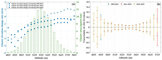 (a) Glacier area and average glacier elevation change rate (AGECR) in each 50 m altitude band, and (b) the uncertainty of corresponding AGECR. The AGECRs in different observation periods are denoted by different symbols. The uncertainty of AGECR in each altitude band was estimated based on the NMAD of the elevation change rate in stable areas (see Section 4.4). The last two altitude bands have no elevation change rate observations in stable areas, and the uncertainties of the AGECRs in these two altitude bands were assumed to be the same as that of the last but two.
