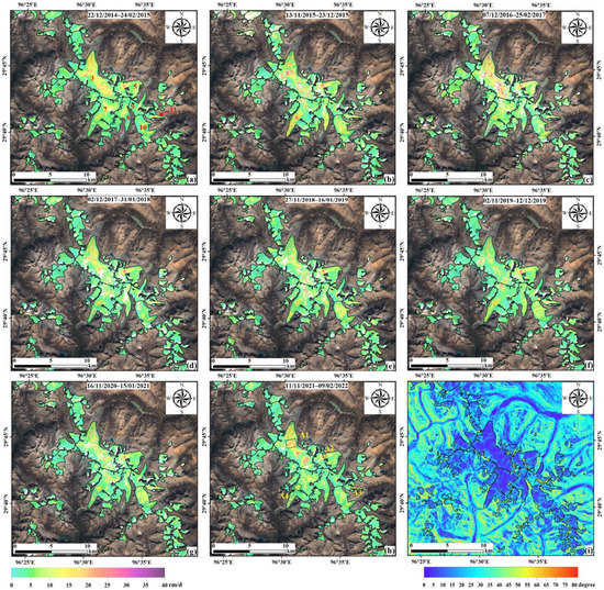 The derived two-dimensional glacier flow velocity during 2014–2021 (a–h), and the ground surface slope (i). The black curves are glacier boundaries. The red numbers in (a) mark the glaciers mentioned in the text. Rectangles A1–A4 in (h) mark the areas where glacier flow velocities in each observation period were averaged (see Table 3). The background of (a–h) is the Sentinel-2 image acquired on 12 October 2021.