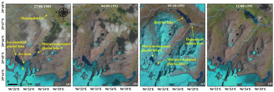 Visual changes in optical images indicate that GLOF occurred twice in our study area during 1990–2013. As shown in Figure 6a, in August 1989 there was a big proglacial lake in the left of the front of glacier 4. The surrounding glacial landforms indicate that this proglacial lake formed after the receding of the western branch of glacier 4. Since the glacier flows over a downslope bed, the eastern side of this proglacial lake was actually dammed by the eastern branch of glacier 4. Moreover, there was a moderate-sized moraine-dammed glacial lake in the downstream valley of glacier 4 (referred to as moraine-dammed glacial lake 1). Figure 6b shows that the ice-dammed glacial lake further expanded towards the eastern branch of glacier 4 between 1989 and 1992. By 9 October 1993, the ice-dammed glacial lake had already burst (see Figure 6c). The drainage of this ice-dammed glacial lake caused the outburst of moraine-dammed glacial lake 1. Subsequently, the flood in the downstream valley triggered a debris flow. A large volume of debris flow mass was deposited at the confluence with the Shuangdui Qu (Qu means river in Tibetan). Consequently, a large barrier lake formed at the west side of the deposits. After this outburst, the ice-dammed glacial lake turned into two moraine-dammed glacial lakes (2 and 3 in Figure 6c). Since the structure of the moraine dam was destroyed, glacial lake 1 continued bursting as the input of glacier meltwater increased (see Figure 6d). By 2021, moraine-dammed glacial lake 1 had already disappeared (see Figure 1), and the tongue of glacier 4 had transformed into a proglacial lake (see Figure 2a).