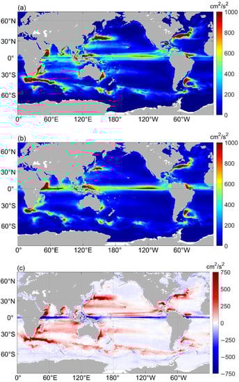Global distributions of climatological kinetic energy. (a) Eddy geostrophic kinetic energy , (b) ageostrophic kinetic energy , (c) differences between and .