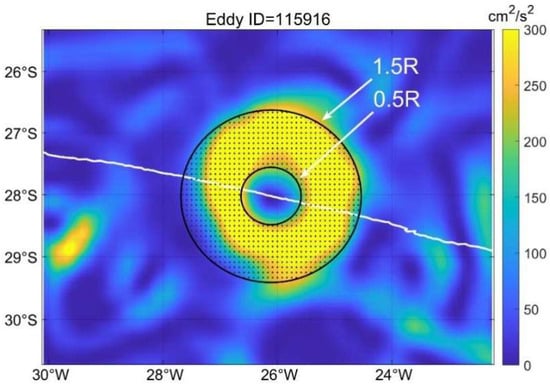 The daily center position and corresponding radius R of the eddies are derived from the eddy-tracking dataset. The area within 0.5–1.5 R around the eddy center is chosen as the main contribution area of the EKE, as in a previous study []. The gridded Ega within this area is averaged to represent the EKE of mesoscale eddies at time t, as shown in Figure 2. As a result, Ega(eddy,t) for a certain eddy can be captured along the eddy track on each day t of the eddy life span. In fact, the variation of Ega(eddy,t) here within 0.5–1.5 R is consistent with that derived from the maximum speed of eddies (not shown), although the mean Ega within 0.5–1.5 R is smaller than that from the maximum speed.