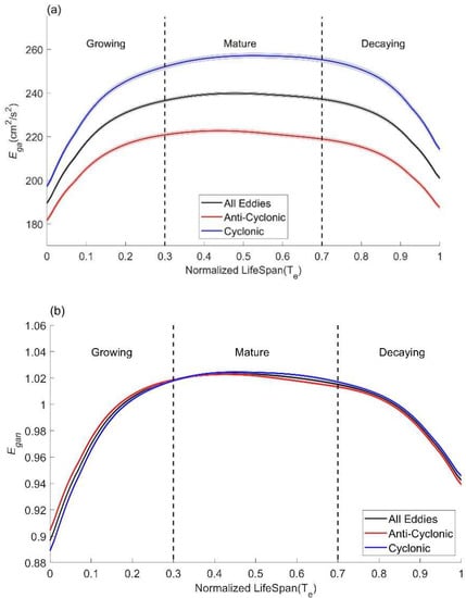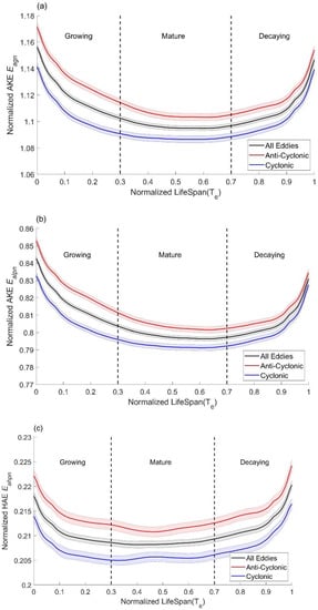 Figure 3a shows the variation of the direct mean EKE Ega for all eddies (black curve), AEs (red curve), and CEs (blue curve) along their tracks during their normalized life span. One can see that the three curves show a similar pattern, i.e., increasing at the beginning, maintaining in the middle, and decreasing at the end. Specifically, Ega for all eddies increases from 190 cm2/s2 at the beginning of the life span to 237 cm2/s2 at 0.3 Te. Subsequently, Ega maintains around 240 cm2/s2 until 0.7 Te and decreases rapidly to 200 cm2/s2 at the end of the life span (black line). The mean Ega over the life span is 229 cm2/s2, lower than 245 cm2/s2 for CEs, and higher than 213 cm2/s2 for AEs.