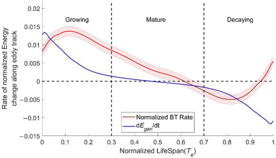 We calculate the BT rate for data grids first and then select values along the eddy track to calculate the integrated BT rate within the range of 0.5–1.5 R during the eddy life span. Then, the integrated BT rate curve is also normalized by its life-mean EKE for each eddy. Finally, the curves of all global eddies are averaged to obtain the red curve shown in Figure 5. One can see that the normalized BT rate is positive in the eddy growing and mature stage, indicating that the energy transfers from low-frequency motions to eddies, while the BT rate is negative in the decaying stage, where the energy transfers inversely from EKE to LAE.